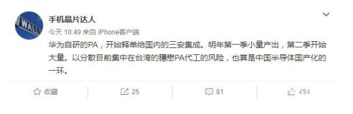 供應鏈消息人士手機晶片達人曝料稱,華為研究開發的PA,開始釋單給國內的三安集成。2020年第1季少量產出,第2季開始大量。以分散當前密集在台灣的穩懋PA代加工的風險,也算作中國半導體國產化的一個環節。