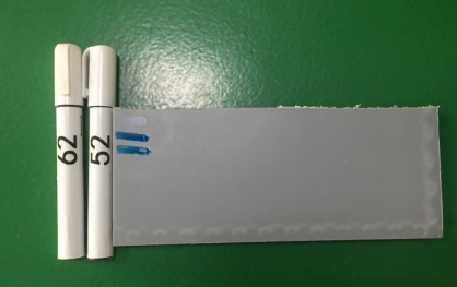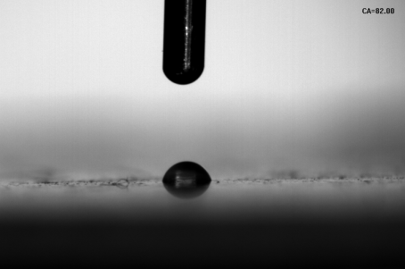通過達因筆進行測試,可以看出此時62達因的達因液有些許收縮,材料表麵達因值能夠達到52達因。通過水滴角測量儀進行測試,得出該參數處理後的水滴角為48°。
